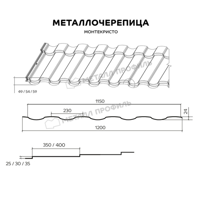 Металлочерепица МОНТЕКРИСТО — это сочетание жёстких линий и округлых черт, которые естественно впишутся в любую концепцию — от модерна до минимализма. МОНТЕКРИСТО обладает целым рядом преимуществ. Это и невидимые стыки, изготовленные по технологии горизонтального 3D-реза, и модифицированная форма бокового замка, гарантирующая герметичность. Компания Металл Профиль предоставляет потребителю возможность подобрать оптимальное соотношение параметров кровли. Заказать вы можете не только длину листа (от 0,5 до 8 метров), но и глубину профиля (49/54/59 мм). Такое количество вариаций призвано удовлетворить персональные запросы заказчика.