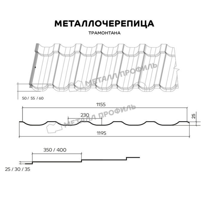 ТРАМОНТАНА — премьера на рынке металлочерепицы. Благодаря усиленной геометрии материал не чувствителен к ветровым нагрузкам и подходит для строительства даже в самых неблагоприятных климатических условиях. Большая глубина профиля (50/55/60 мм на выбор) в паре со срезанным гребнем волны придают металлочерепице ТРАМОНТАНА неповторимое обаяние. Помимо прочих плюсов новинки, стоит отметить её 100% герметичность. Это возможно благодаря усовершенствованной конструкции бокового соединения — две капиллярные канавки не дают осадкам попасть под крышу. Эту же задачу решает и хорошая стыковка листов, прошедших серьёзный многоступенчатый контроль. Горизонтальный нахлёст стальной черепицы ТРАМОНТАНА незаметен на готовой кровле за счёт обрезки нижней кромки по форме волны. Новый профиль выпускается с полимерными покрытиями сегментов Премьер и Премиум в линейке Компании Металл Профиль. Покрытия имеют широкий ассортимент цветов, включая оттенки «металлик», а также отличные технические характеристики, которые гарантируют вам крепкую кровлю на долгие годы*.