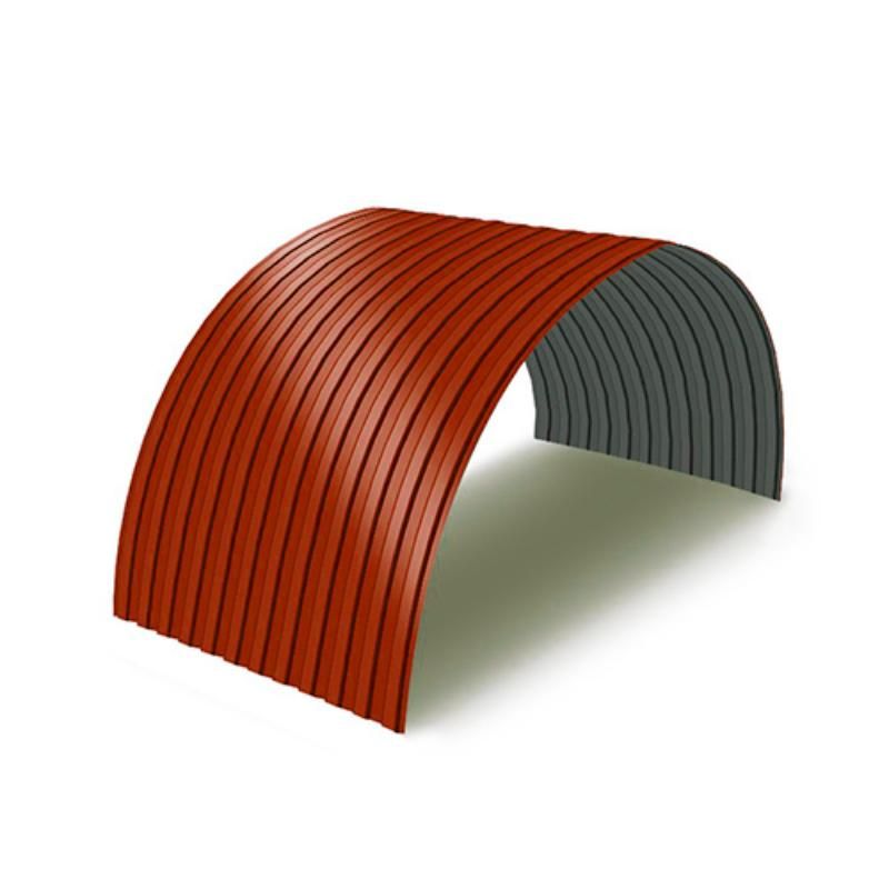 Профнастил для арочных перекрытий используется прежде всего при строительстве различных арочных конструкций, у которых существует определенный изгиб по радиусу. Он активно применяется при возведении ангаров, складов, зернохранилищ, различных округлых и полукруглых вариантов крыш и кровли. С его помощью можно построить как большое здание сельскохозяйственного назначения, так и красивый эстетичный навес для автомобиля площадью несколько квадратных метров. Основной отличительной особенностью данного вида профлиста является его изогнутая по радиусу форма, сформированная на специально предназначенной для этого профилегибочной линии. Радиус изгиба может быть самый разнообразный, и зависит прежде всего, от требований заказчика и характеристик будущего здания. Плюсами такого материала являются как его изготовление в заводских условиях, так и геометрическая точность, в результате чего стыки листов практически не видны и конструкция выглядит действительно монолитной.